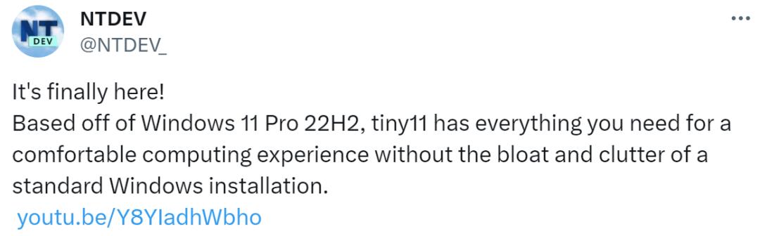 去年 2 月,NTDEV 在 X 上宣布了一个 Tiny11 的早期版本:“它终于来了!Tiny11 基于 Windows 11 Pro 22H2,既拥有舒适的计算体验,又没有标准 Windows 的臃肿和杂乱。”具体来说,Tiny11 是微软 Windows 11 操作系统的精简版,它将 Windows 11 安装程序的磁盘空间从 20+GB 缩减到约 8GB,并能在仅有 2GB 内存的系统上“出色运行”。