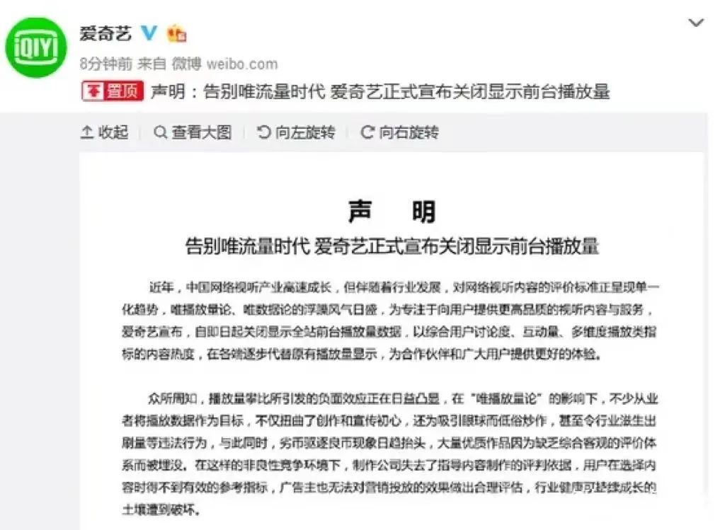 早在2018年爱奇艺关闭前台播放量时,就在声明中提到,播放量的乱象会让制作公司失去指导内容制作的评判依据,广告主也无法对营销投放的效果作出合理评估。此前也有影视导演向毒眸表示,不造假、不掺水分的数据,对于认真做内容的人而言是好事。