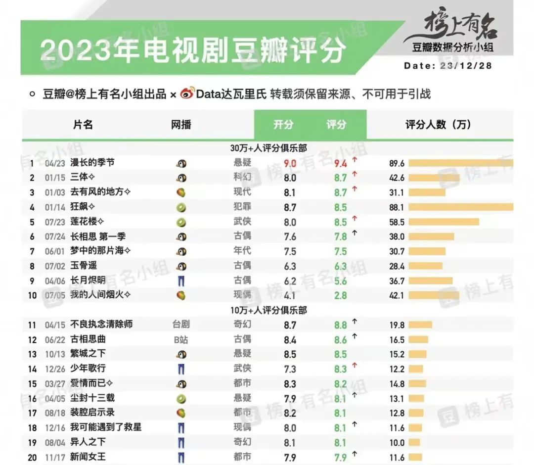 对于本来就与个人审美偏好密不可分的剧集而言,这种定义方式看似也并非不合理,只不过在缺少“统一标准”的前提下,每年能让全民达成“共识”的爆款剧的确越来越少,也越来越难有说服力了。多的是“各花入各眼”,和略显眼花缭乱的“热度值战报”。