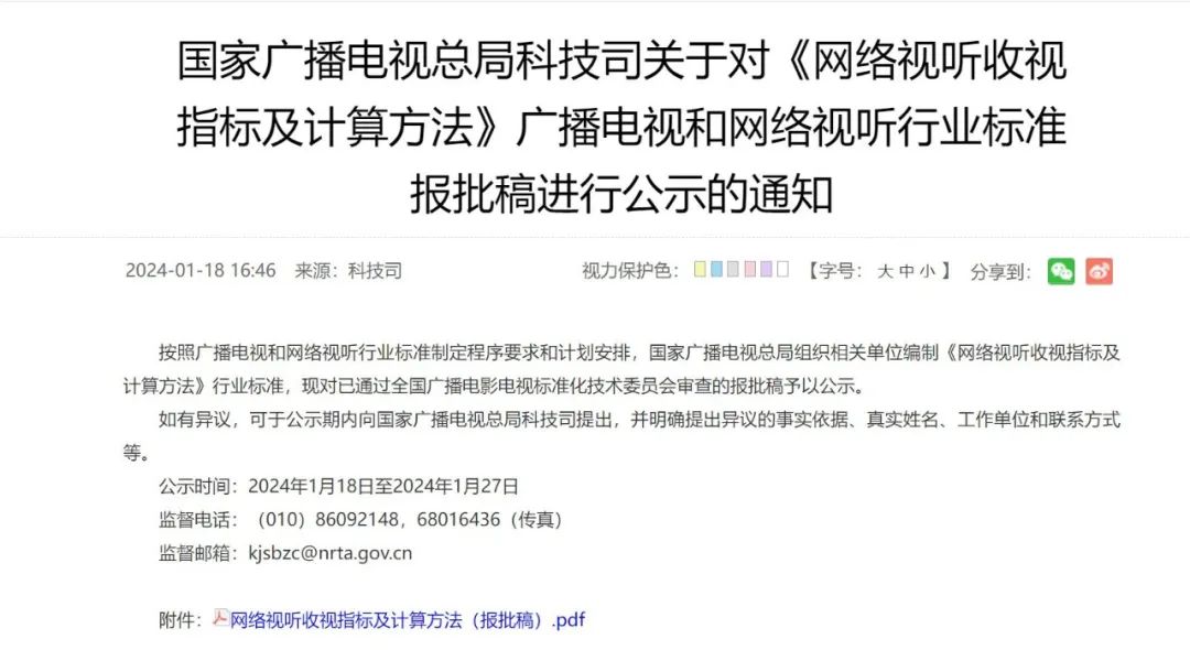 现在,这种情况有望得到改善。1月18日,广电总局在官网刊载了“国家广播电视总局科技司关于对《网络视听收视指标及计算方法》(以下简称“方法”)广播电视和网络视听行业标准报批稿进行公示的通知”(以下简称“通知”)。