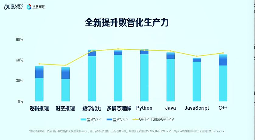 整体参数上,星火V3.5在语言理解、数学能力已超过GPT-4 Turbo,代码能力和多模态理解能力,都已达到GPT-4V能力的90%以上。