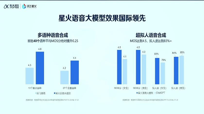 新发布的“星火语音大模型”,基于大语言模型框架,结合讯飞语种、音色、内容等多维度语音属性解耦表征预训练而成。它可以实现多语种并达到超拟人的语音合成效果。其首批40个语种平均MOS分(评估音频或视频质量的一种标准,5分为最高)提升了0.25,拟人测试中MOS达到4.5分,拟人度达到83%,拟人语音合成能力超越ChatGPT。