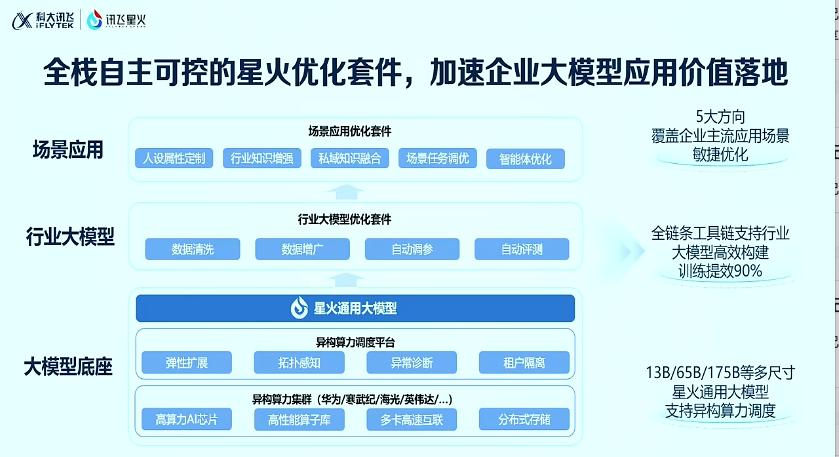 底层,星火通用大模型有13B、65B、175B等多种尺寸,支持异构算力调度,行业大模型方面上,星火的全链条工具链可以行业大模型训练效率提升90%,支撑企业主流场景的应用优化。