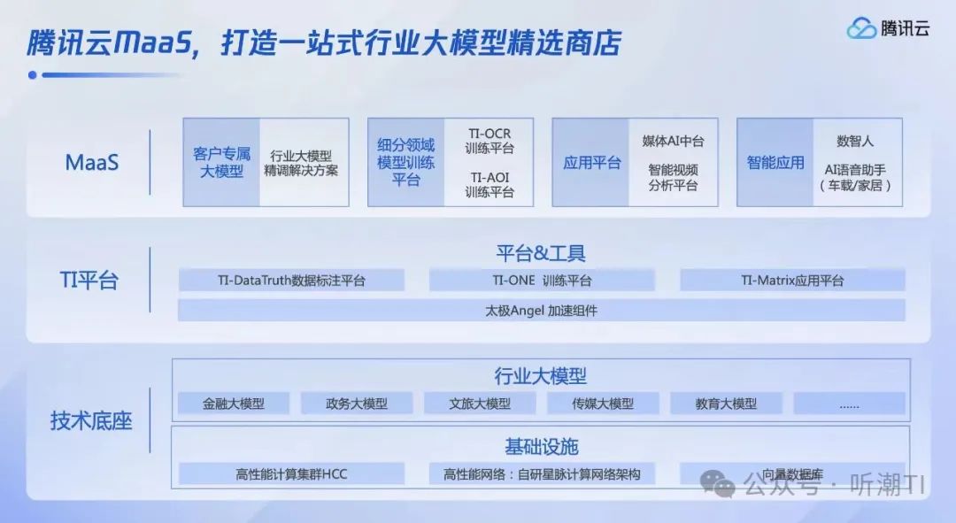 腾讯云TI平台内置了多个高质量行业大模型,涵盖金融、传媒、文旅、政务、教育等多个行业场景,这些行业大模型基于腾讯在产业互联网领域沉淀下来的经验,结合高性能计算集群HCC、高性能网络、向量数据库等基础设施,以及混元大模型,共同构成技术底座。