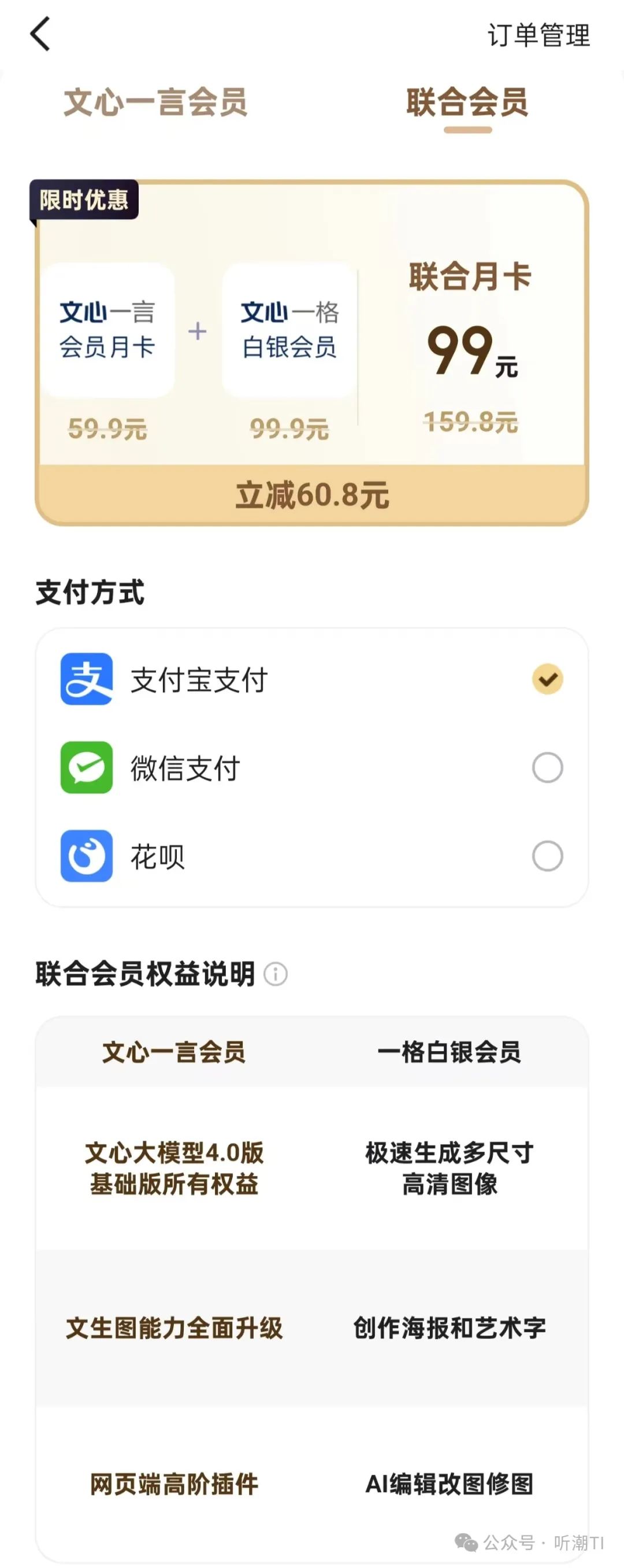 去年11月1日文心一言上线了专业版,定价59.9元/月,连续包月优惠价为49.9元/月,付费会员的一项核心权益是模型能力升级到了最新的文心大模型4.0,用户同时可以选择购买“文心一言+文心一格”的联名会员,联合月卡定价为99元。