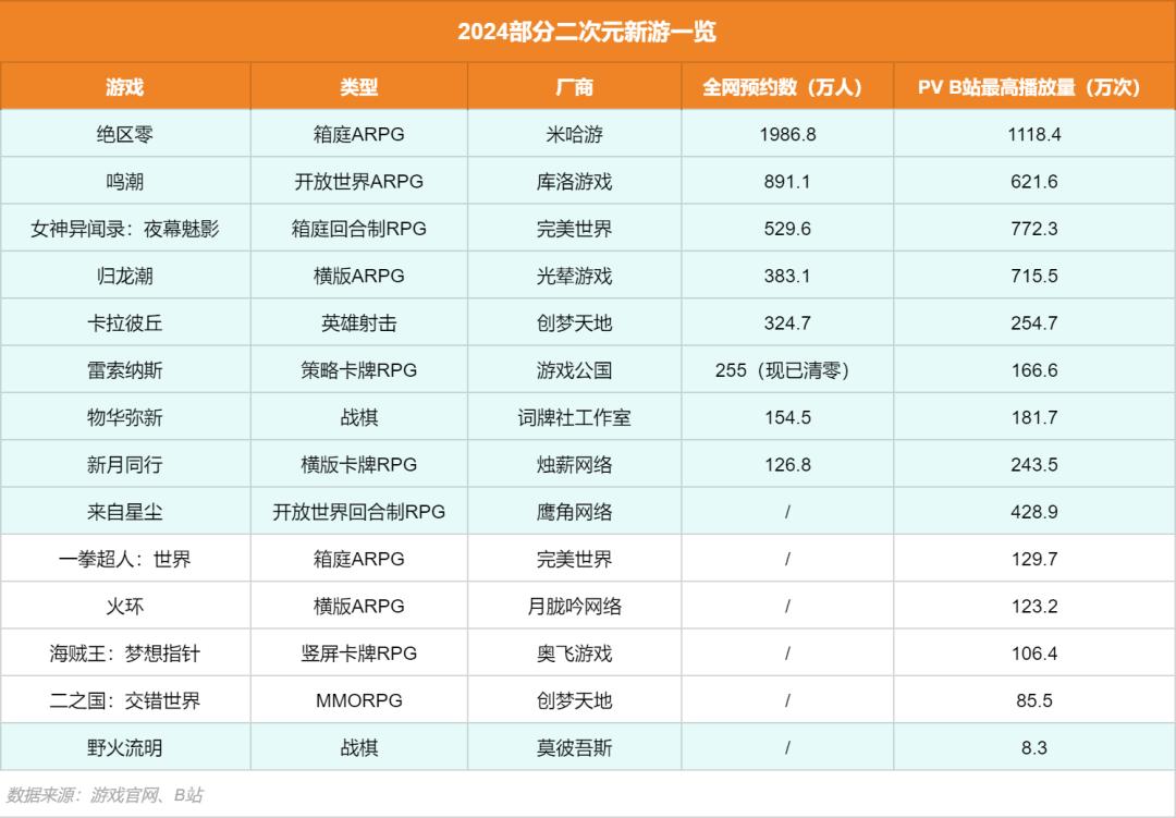 事实上,在经历了去年的大逃杀后,市场上仍有不少存量二游已拿到版号,并将在今年上线。其中不乏一些大厂的重点产品,以及在玩家中关注度很高的新锐游戏。对此,我们将从全网预约数和PV播放量两个量化指标入手,看看2024年的十大潜力二游都有哪些?
