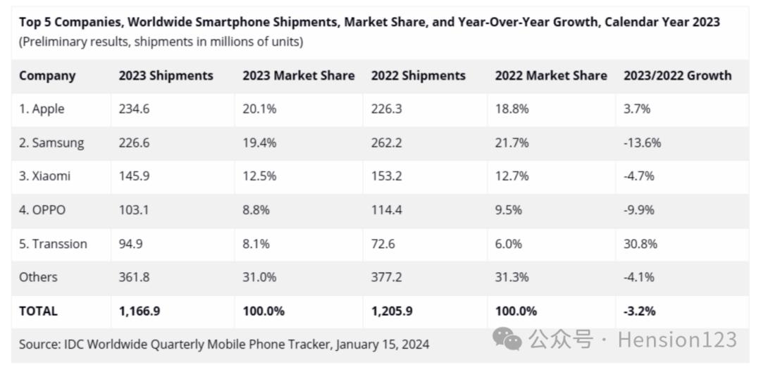 随着2023年的落幕,手机市场又经历了一场激战。据调研机构IDC的数据,今年全球智能手机出货量同比下滑3.2%,总数仅为11.7亿部。