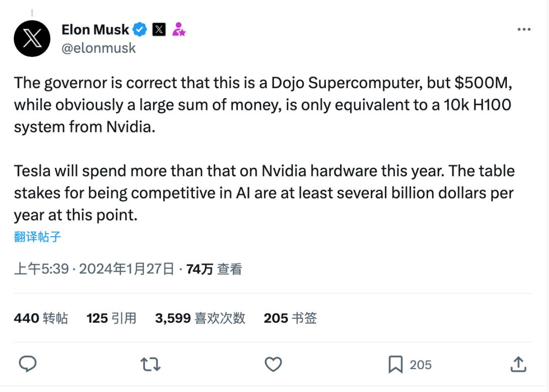 算力是AI军备的基础,前有Meta的扎克伯格说到24年底要囤够35万张英伟达的H100,后有马斯克发推说5亿美元虽然看起来是一大笔钱,但实际上只能买1万张H100,而特斯拉今年买卡的钱肯定会超过这个数。
