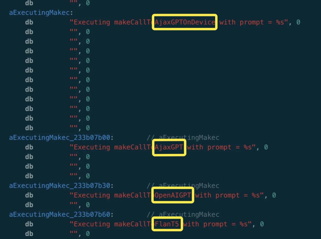 除了调用Open AI的模型,SiriSummarization框架还调用了谷歌的Flan-T5,以及苹果自研的AjaxGPT和AjaxGPT On Device(大概率是一个参数量更小的端侧模型)。