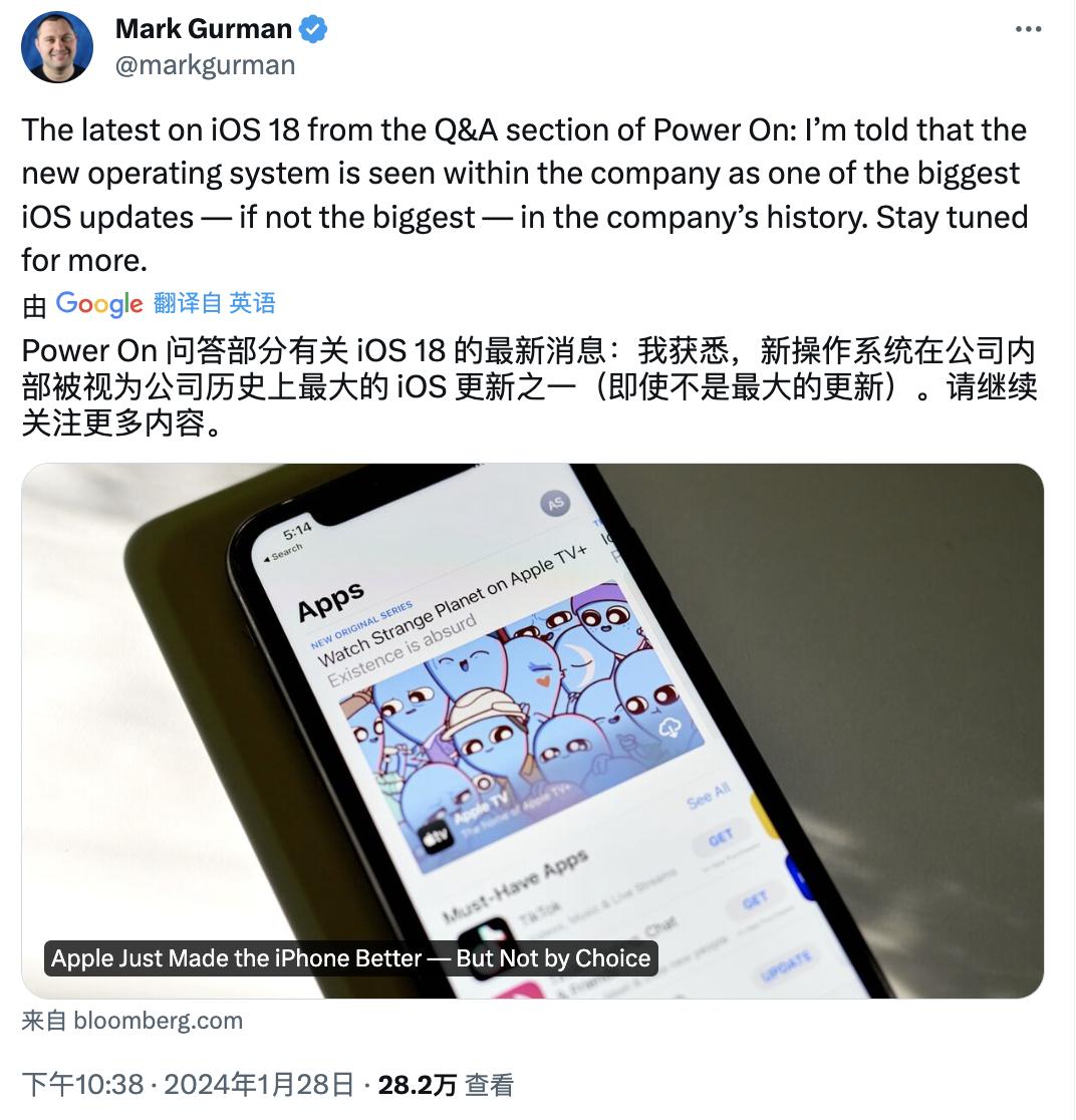 近日,知名爆料人古尔曼(Mark Gurman)说苹果iOS 18或迎来公司历史上最大的更新。