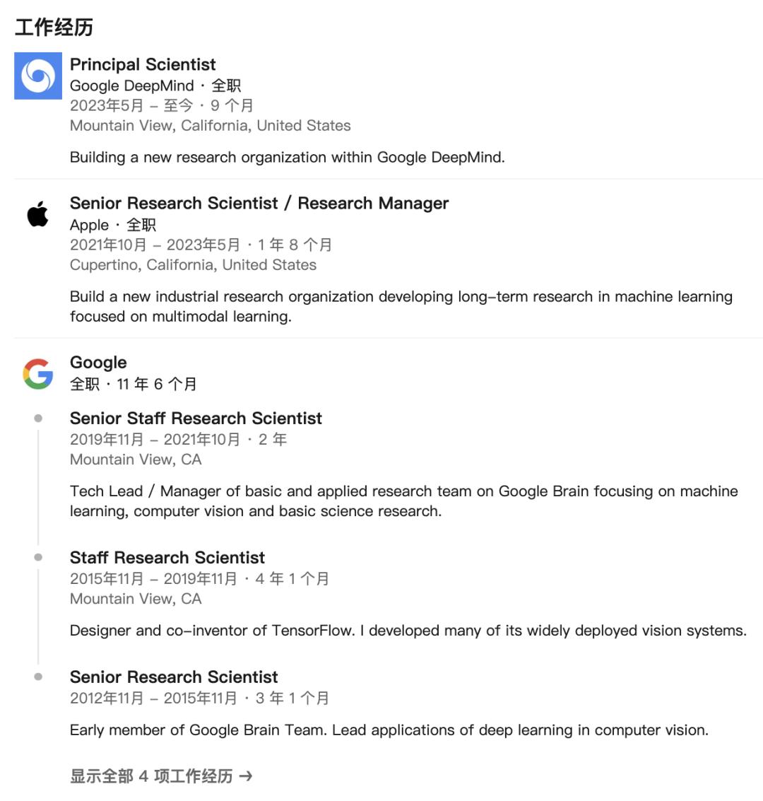 多模态学习(Multimodal Learning)团队的负责人是乔纳森·什伦斯(Jonathon Shlens),他从谷歌跳槽到苹果只待了1年零8个月,就又跳回了谷歌。