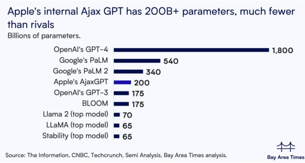 23年7月份,万众瞩目的苹果自研模型AjaxGPT首次曝光,拉动其市值增长近700亿美元[4]。