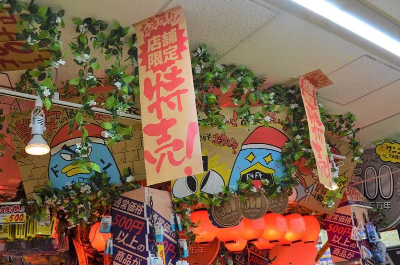 大量设置POP广告是唐吉诃德的特色之一。其做法跟店内的商品陈列方式一致,都采用了压缩陈列。广告文案使用大字体,彰显出店铺的自信,顾客也因此被打动而购买。