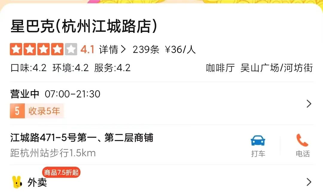 杭州一家位于西湖的星巴克为照顾到周边商务区顾客,将开门时间提前到早上7点,还覆盖了周边早上的外卖。