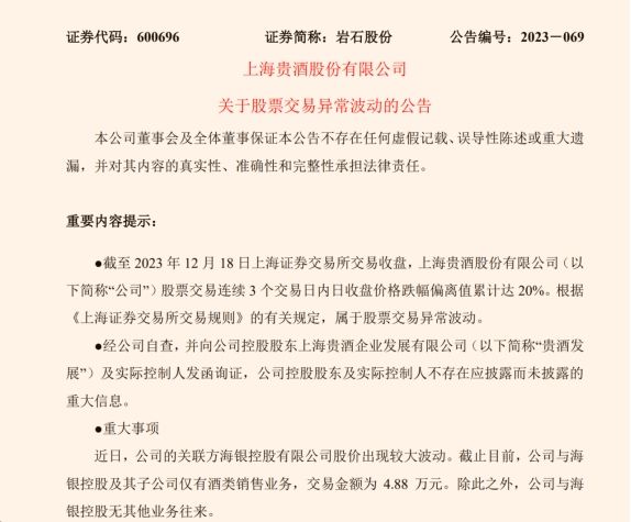 虽然上海贵酒在12月18日就及时发公告来撇清关系,但也“为时已晚”,岩石股份(上海贵酒)的股票已呈现下跌的状态,在12月14日、12月15日、12月18日连续3个交易日内日收盘价格跌幅偏离值累计达20%,甚至在12月14日以及12月18日惨遭跌停。