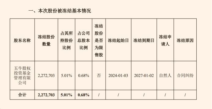 据悉,控股股东上海贵酒的一致行动人五牛基金持有公司股份数量为 45,395,707 股,占公司总股本的 13.57%;五牛基金累计冻结股数为 2,272,703 股,占其直接持股数量的 5.01%,占公司总股本的 0.68%。