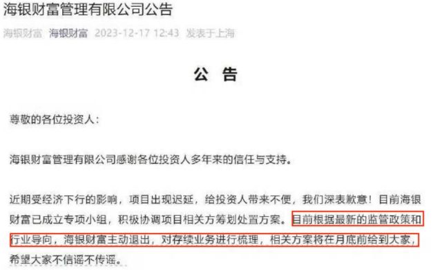 随后在12月17日,海银财富官微发布公告表示,近期受经济下行的影响,项目出现迟延,海银财富主动退出,对存续业务进行梳理,相关方案将在月底前给到大家。