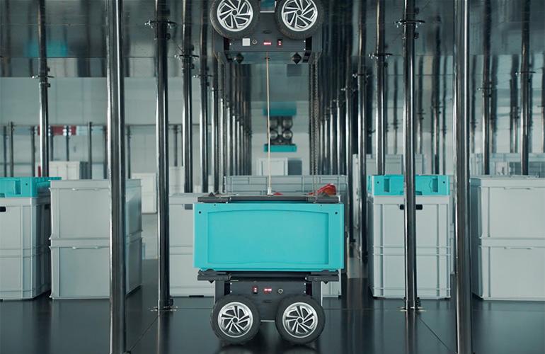 一个倒置的 Instock AMR 从另一个 AMR 中抓取一个垃圾箱