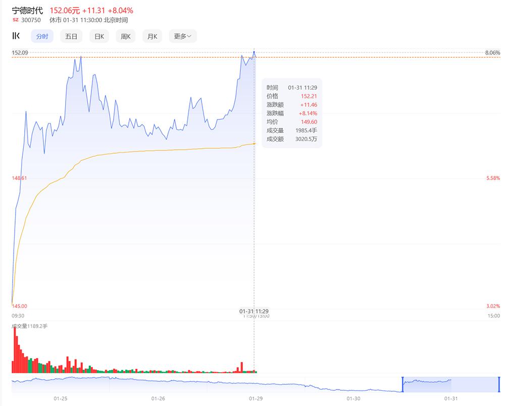 受到良好财务成绩的影响,今天一开盘,宁德时代的股价就迎来一路飙升,最高股价报152.21元/股,上涨8.14%,最高市值约为6695.7亿元,一夜暴涨超500亿元。