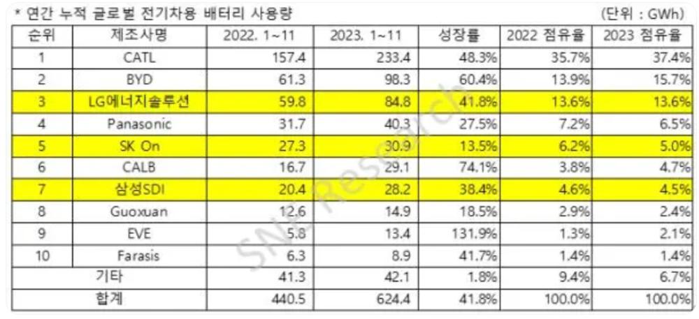 ▲海外机构SNE Research公布的2023年前11个月全球动力电池市场数据