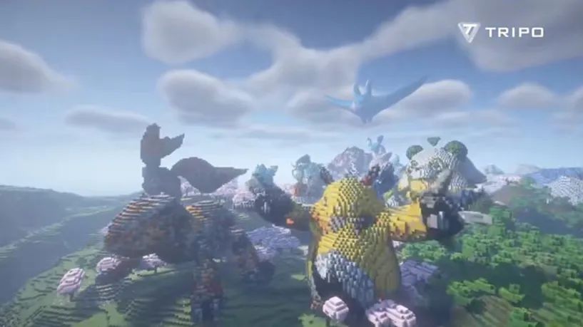 除了文生 3D 之外,Tripo 也能进行图生 3D。视频结尾,一排宝可梦风格的两脚兽,四脚兽,飞禽,在 Minecraft 世界里组成了一个微观小花园一样的建筑群,显得诡异又壮观。