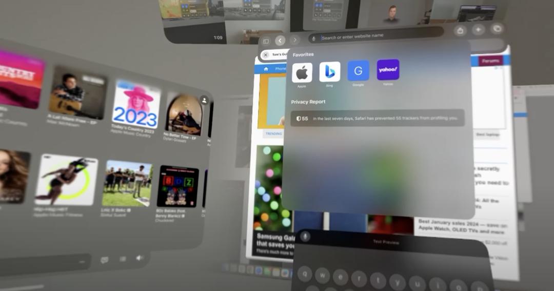 科技博主Tom’s Guide尝试同一时间打开七八个程序,如浏览器、苹果音乐、以平铺或者叠加的方式放在眼前。