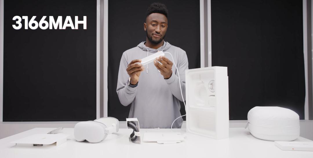 从Vision Pro头显包装盒中,苹果共提供了11样小东西:头显x1、前屏保护套x1、绑带x2(单绑带和双绑带)、眼镜布x1、质保卡x1、3166mAH电池x1、30w充电头x1、双C口的数据线x1、新手指南x1、半包裹式的橡胶圈x2、面罩x1。