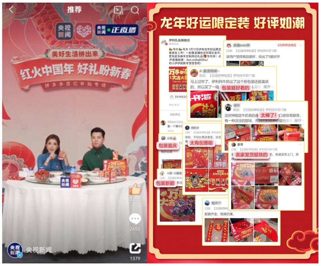 拼多多「百亿补贴」联合央视新闻推出的年货直播中,伊利纯牛奶好运限定装迎来热销