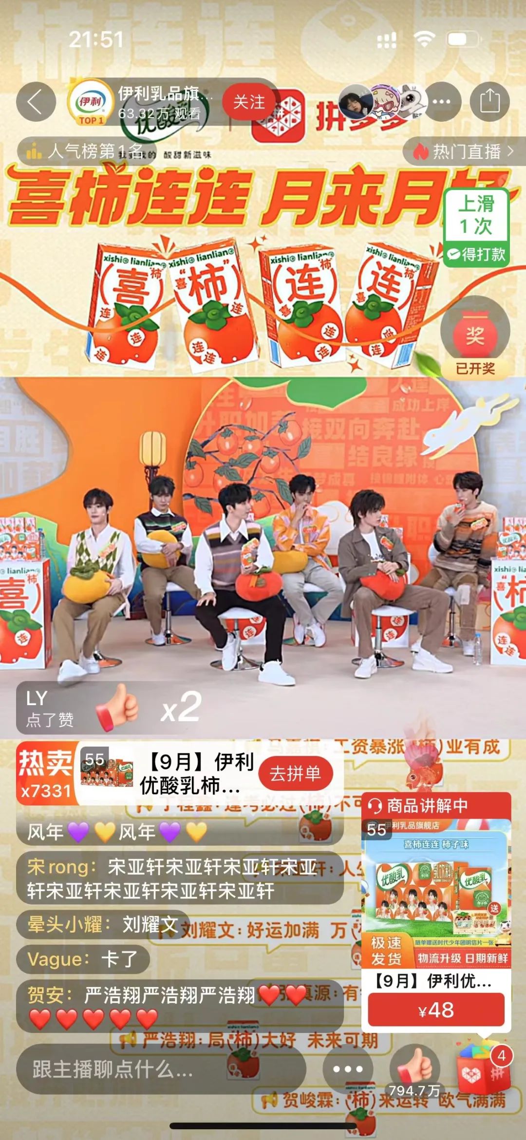 2023年中秋,伊利优酸乳推出拼多多独家专供的新品柿子口味优酸乳,并邀请品牌代言人时代少年团来到拼多多直播间