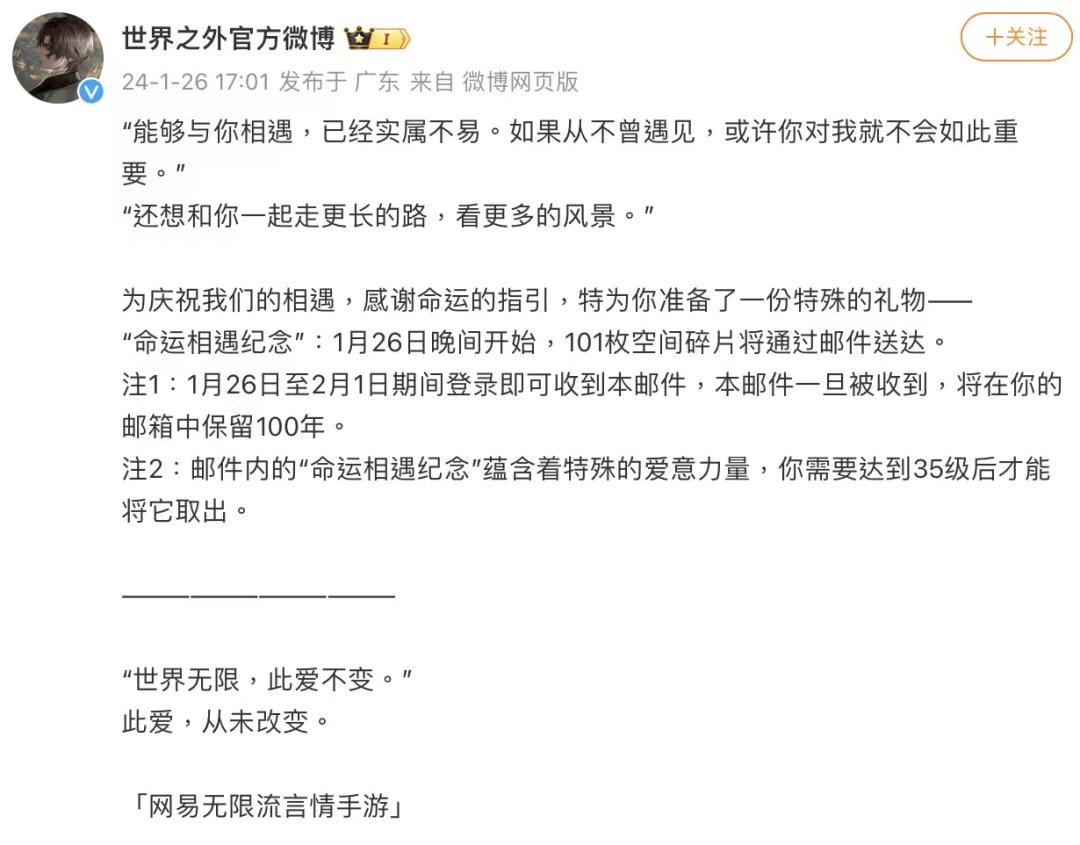 就在玩家们还回味于派对游戏《元梦之星》的开局福利之际,乙女游戏也甩出一个慷慨的开局。《世界之外》定档后,官微给出“101抽免费送”福利。同时,“活跃的不像官号”的《世界之外》在《恋与深空》《光与夜之恋》等多款同类型游戏官微评论区留言称:一起做大做强。