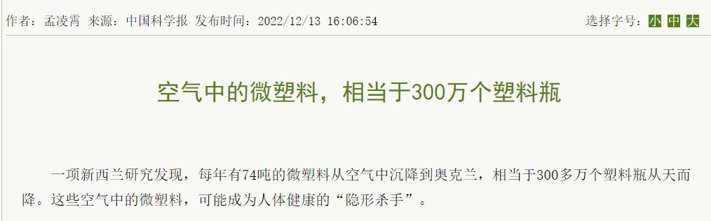 中国科学报,空气中的微塑料,相当于 300 万个塑料瓶