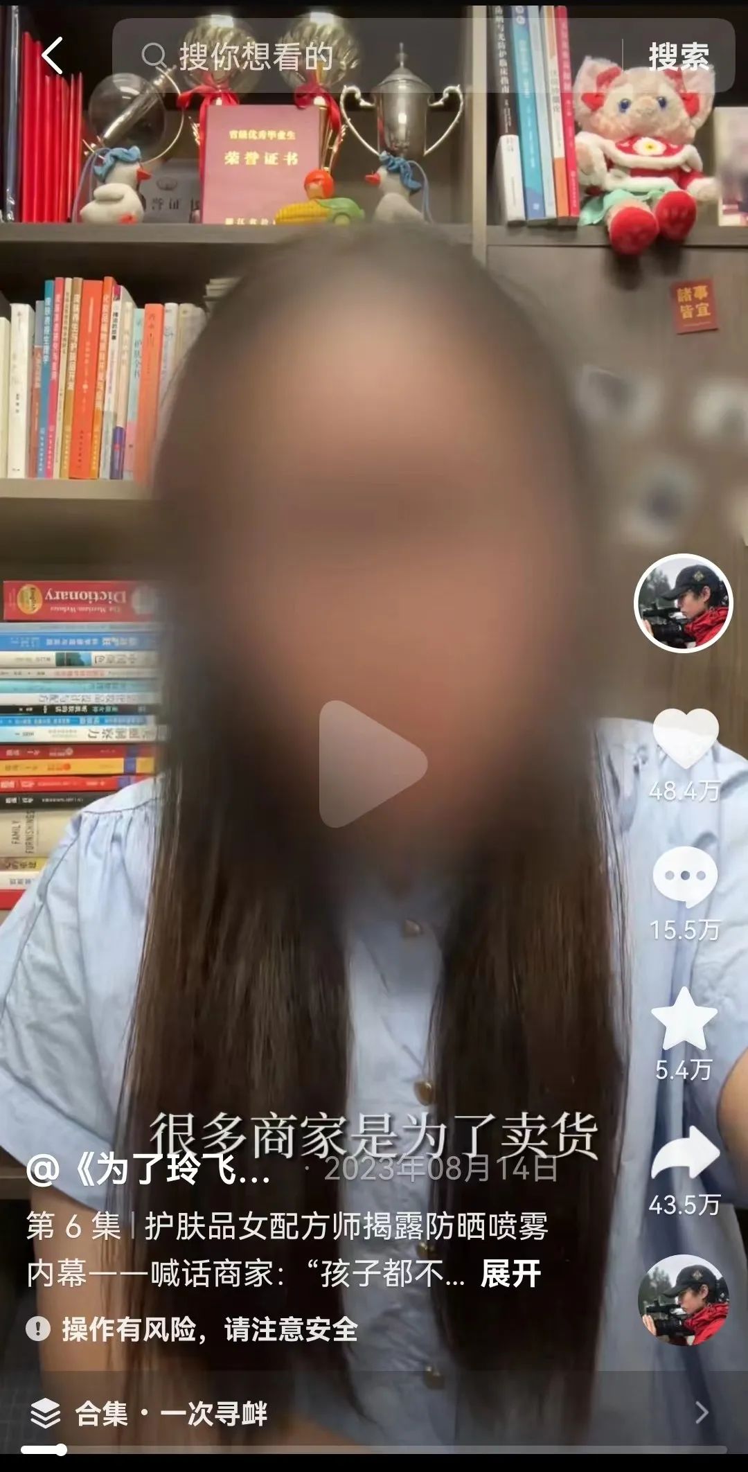 青眼根据该配方师的介绍搜索了解到,去年8月14日,“为了玲飞”曾在抖音平台上发布了一则“护肤品女配方师揭露防晒喷雾内部——喊话商家:‘孩子都不放过’”的视频。视频中,一位女配师直言,不少商家为了推广产品使用了错误的引导视频,如画面中含有用防晒喷雾直接喷脸的动作。