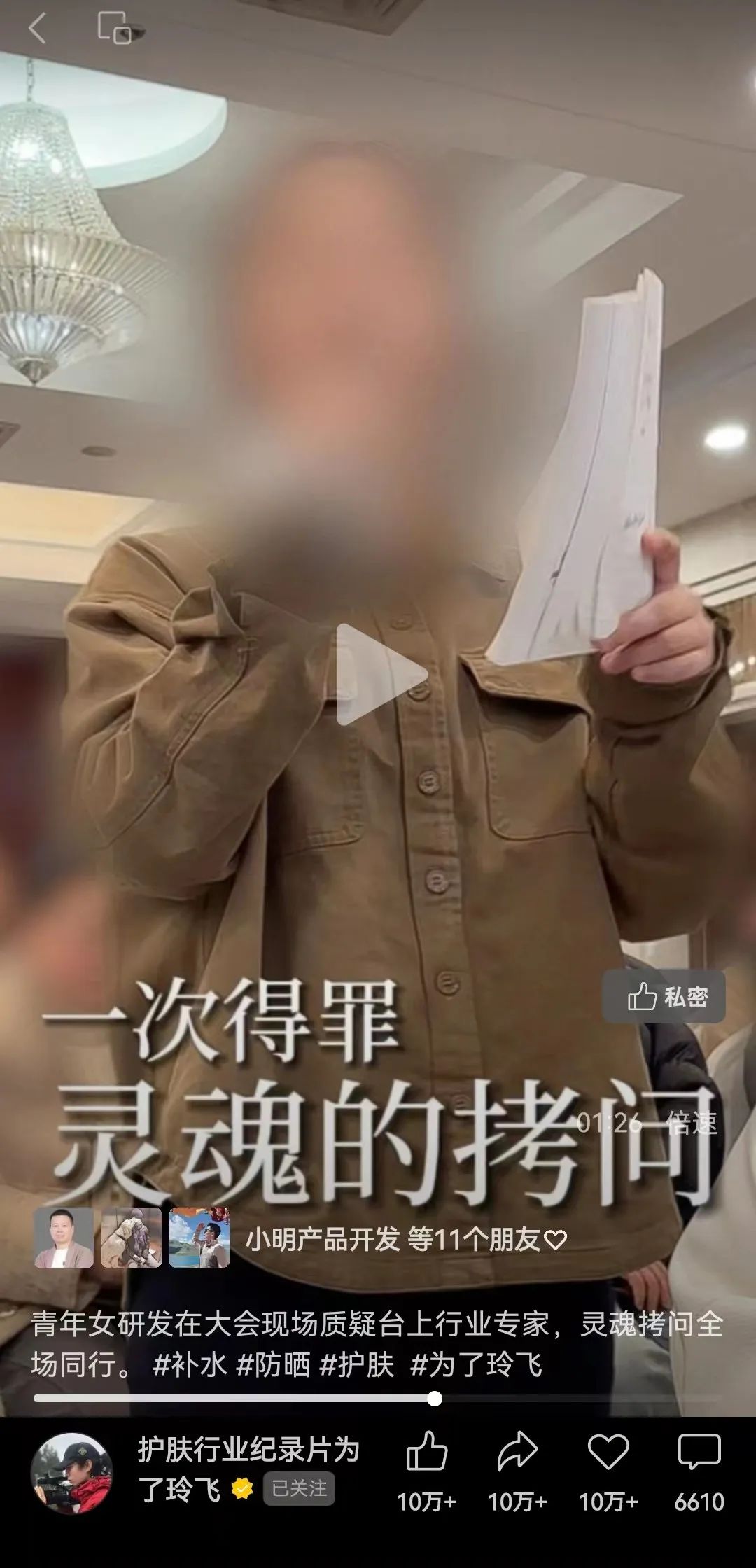 近日,自媒体账号“护肤行业记录片为了玲飞”(下称“为了玲飞”)发布了一则名为“一次得罪灵魂的拷问”的视频,其中,一位95后女性配方师在某行业大会现场,质疑台上行业专家并灵魂拷问全场同行,引发了广泛关注。
