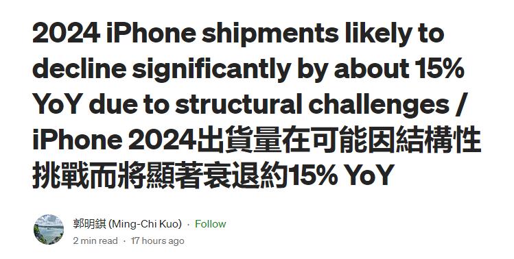 就在市场等待通过苹果财报预判后市走向之时,长期关注苹果的分析师郭明錤给市场浇了一盆冷水。他在博客平台Medium上发布的最新供应链调查显示,苹果已经下调2024年iPhone的出货预估至2亿部,同比下滑15%,在今年全球主要手机品牌中,苹果可能是衰退幅度最大者。