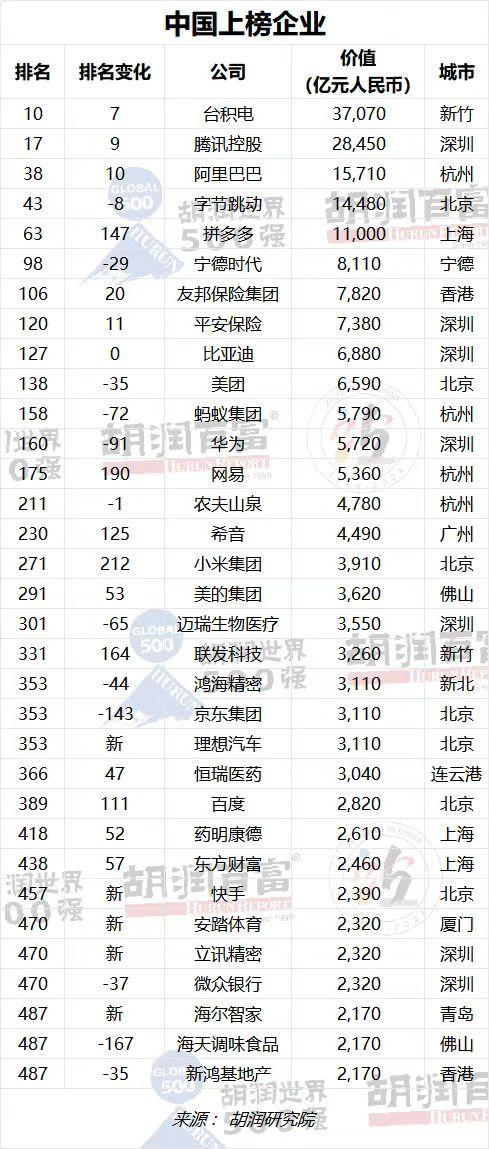 胡润研究院表示,在上榜中国企业中,价值增长最多的是台积电,增长1.4万亿元;其次是腾讯,增长9300亿元;然后是拼多多,增长6700亿元。这些中国公司分布在13个城市,以深圳和北京为首,各有7家,杭州有4家。整体来看,依托互联网技术崛起的平台,仍是上榜企业中的主力之一。