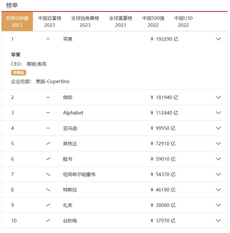 1月31日,胡润研究院发布了《2023胡润世界500强》名单,列出了世界500强非国有企业,并按照企业市值(以2023年10月31日收盘价计)或估值(参考同行或最近一轮融资)进行排名。最新排名显示,苹果、微软、谷歌母公司字母表、亚马逊、英伟达、脸书/元、伯克希尔哈撒韦、特斯拉、礼来和台积电,分别占据前十席。