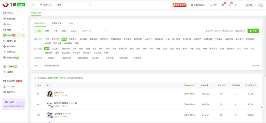 此外,据飞瓜数据抖音版带货达人榜显示,在1月30日,直播带货美妆商品销售榜单上,“与辉同行直播间”位列前三。