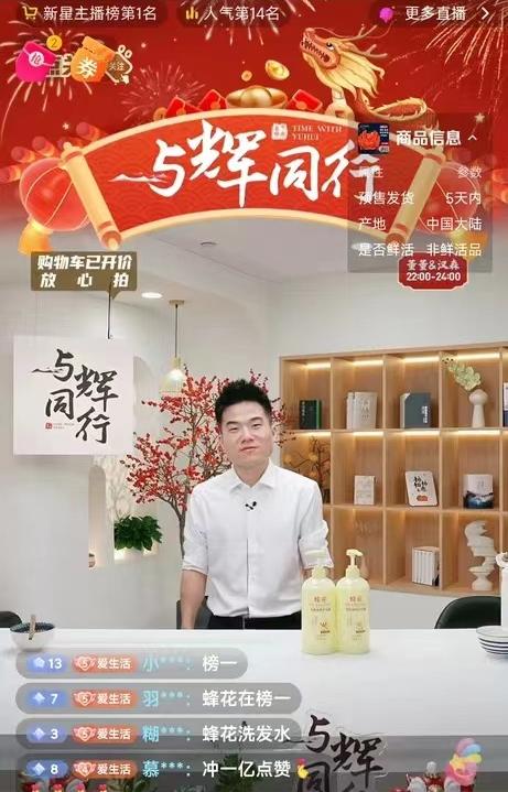 据了解,董宇辉带货的是“蜂花柔顺营养护发素”,机制为36.9元两瓶1升装,带货期间,蜂花抖音官方账号还冲到了“与辉同行”直播间榜一。蜂花的该款商品链接5分钟内显示“热卖9999+”,从20时左右到22时左右,该链接销量从“已售1万”一跃至“已售3.9万”,约卖出2.9万单,销售额破百万元。