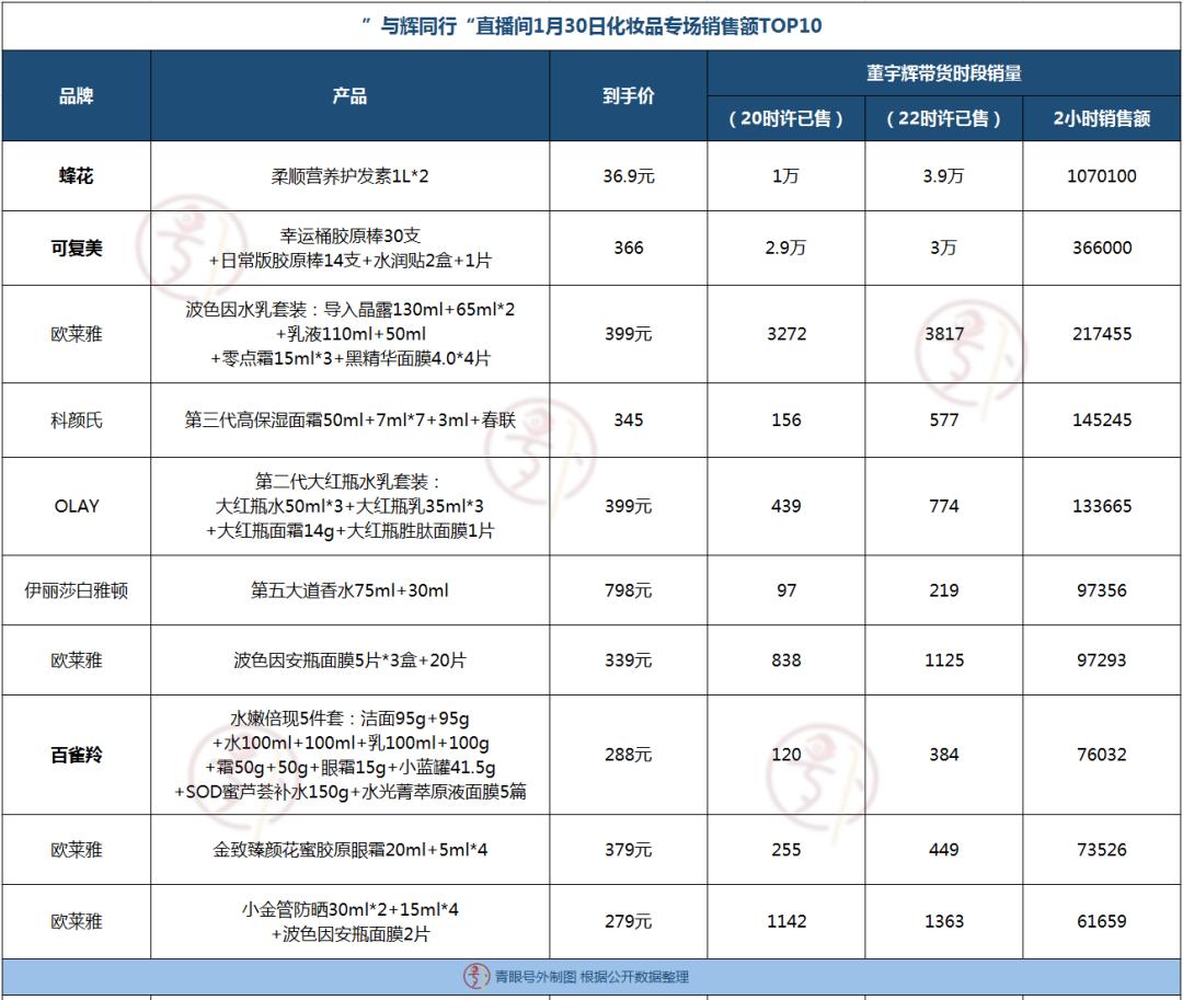 青眼号外注意到,在董宇辉出镜上播的两个小时里,其带货化妆品销售额粗略计算超过288万元。1月30日全天,“与辉同行”直播间化妆品销售额预估850万-1250万。