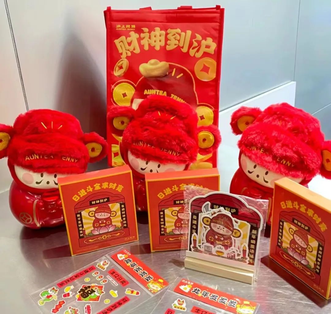 沪上阿姨直接和“财神爷”联动,推出“财神到沪”活动,招财帽、“抱”富大桶、日进斗金求财龛等周边,主打一个财气满满。