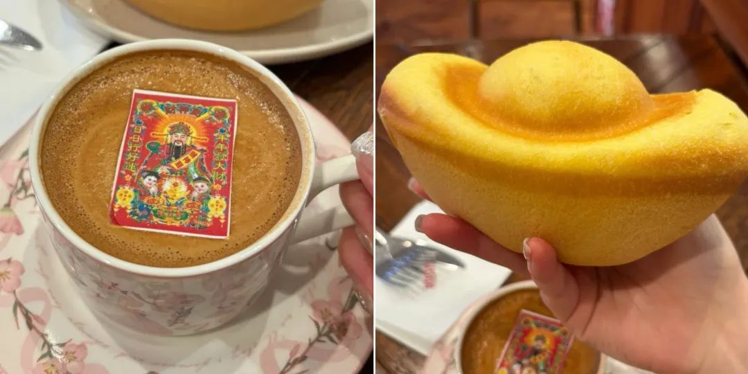 除了推“财神咖啡”,我发现,上海一家名叫Ribone Cafe的咖啡店,还配套推出了金元宝乳酪、摇钱树慕斯、五谷丰登、发财可露丽等。