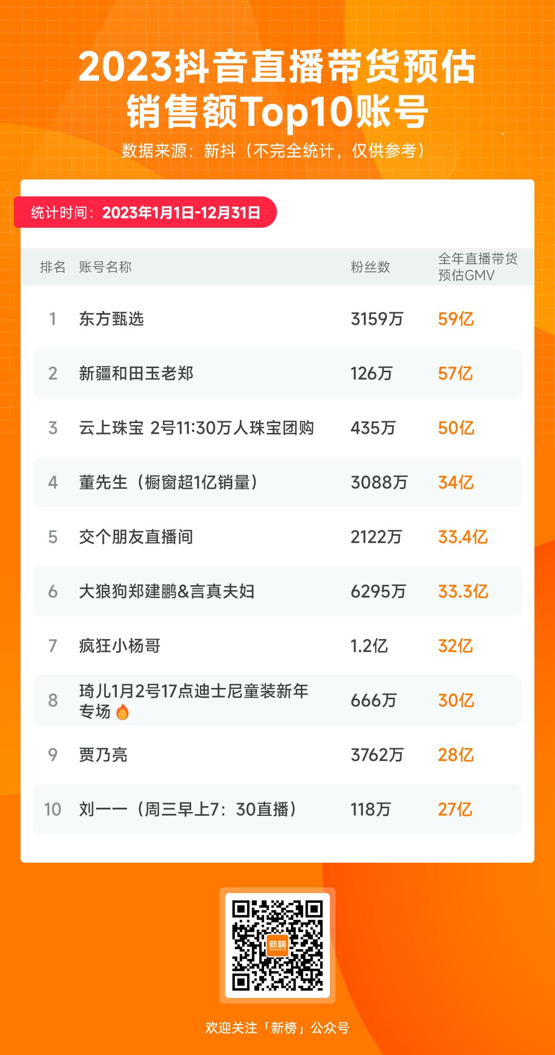 2023年,“东方甄选”以全年直播带货预估GMV59亿元的成绩,成为抖音全年直播带货预估销售额最高的账号。
