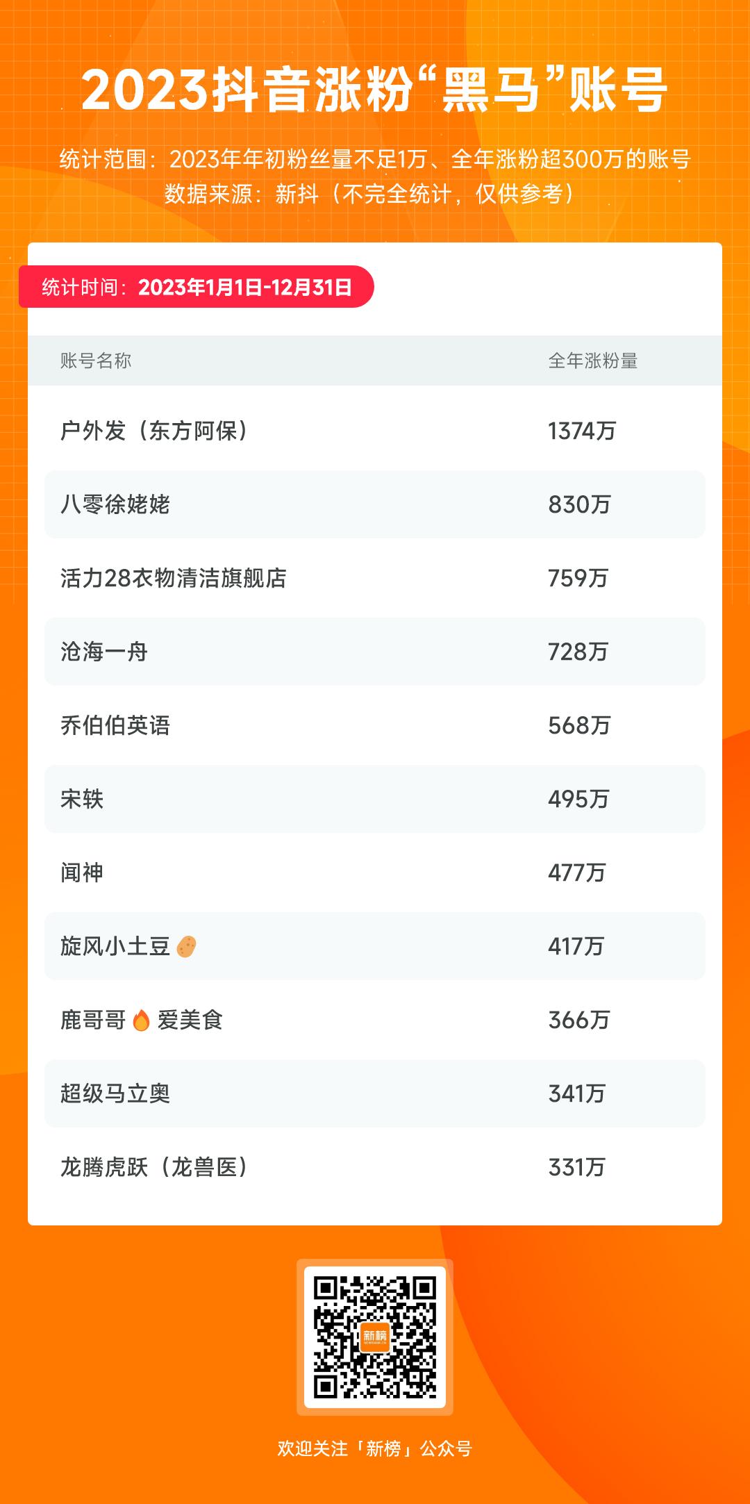 据新抖数据不完全统计,在2023年年初不足1万粉的账号中,有11个账号实现了全年涨粉超300万。