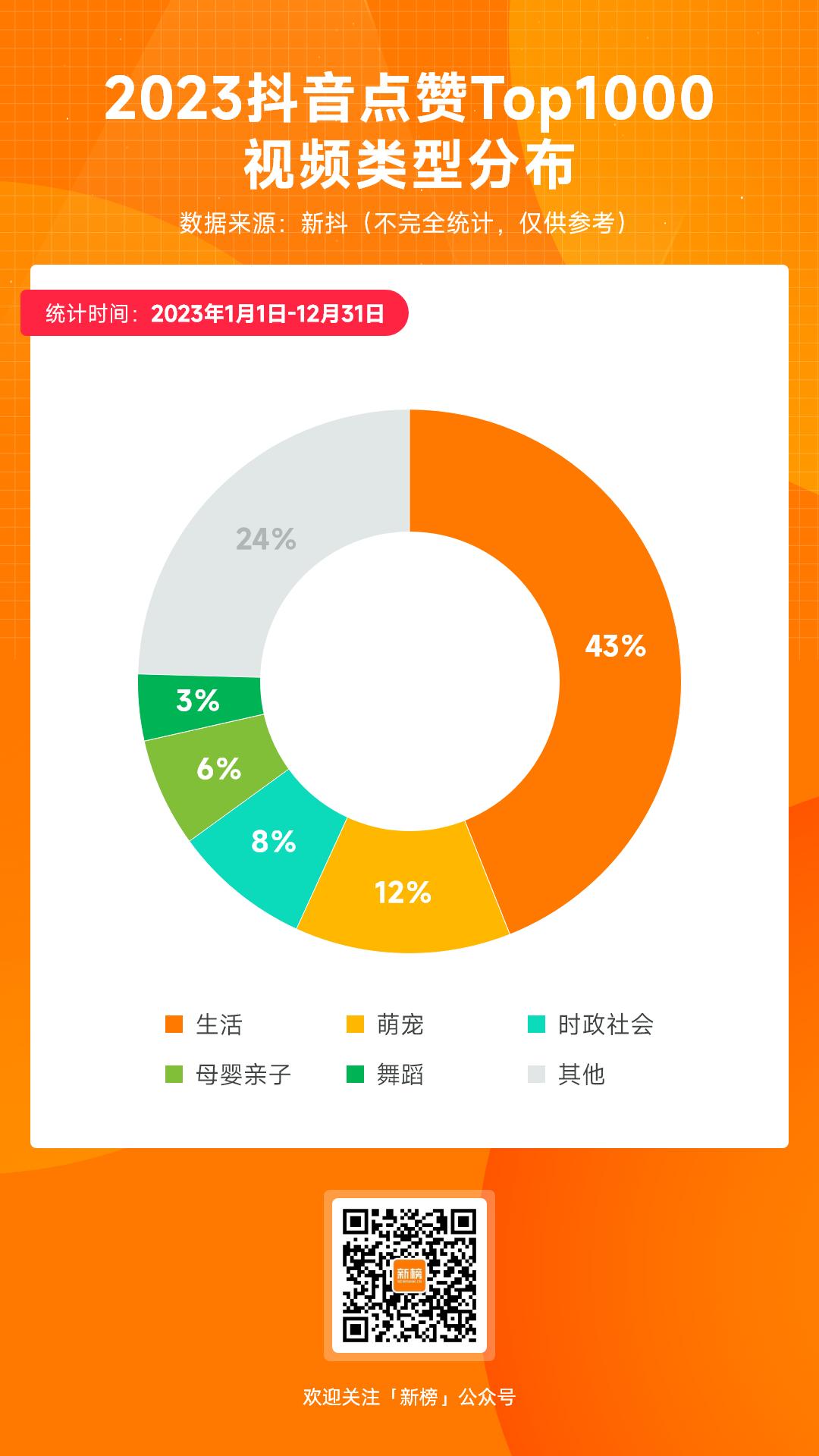 据新抖数据不完全统计,抖音2023年获赞Top1000的视频,其中近一半都与生活相关。