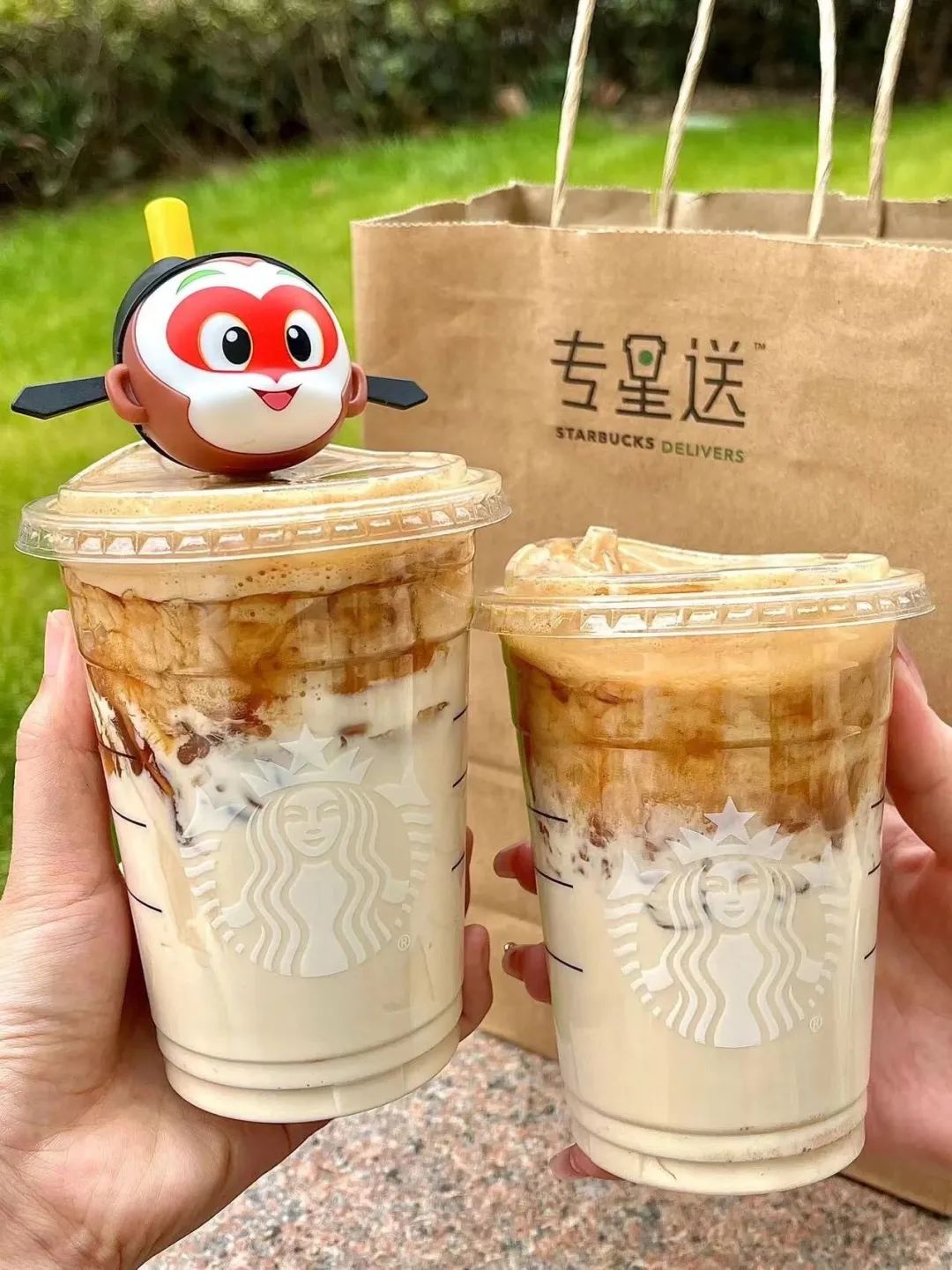 除了饮品,此次联名星巴克还定制了周边产品,大圣金箍棒造型的咖啡吸管,以及可以发出声音的大圣造型挂件。而关于外卖专送,根据官方介绍,在大约20分钟的配送过程中,咖啡缓缓凝聚,形成分层,增添风味。