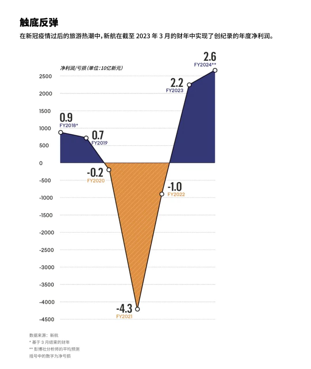 在经历了三年总计55亿新元的巨额亏损后,在截至去年3月的财年中,该公司的净利润反弹至创纪录的22亿新元。据彭博社估计,在本财年的上半年,新航的净利润达到了14亿新元的历史新高,全年净利润将超过26亿新元。疫情期间发行的可转换债券大部分已被赎回,新航股价较疫情期间的低点上涨了一倍,淡马锡和其他股东从中赚得盆满钵满。