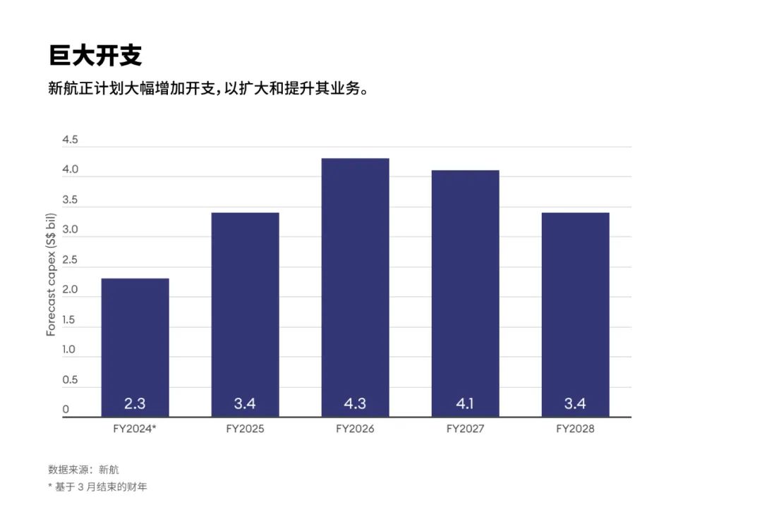 新航利用这笔资金对机队进行了扩大和更新,以便为疫情过后的时代做好准备。在此期间,它接收了36架新飞机(使其飞机总数达到了200架左右),未来几年还将从空客、波音和巴西航空工业公司手中再接收100架。就在新航如此这般的时候,竞争对手还在削减开支和封存飞机。随着飞机的交付,预计到2025年3月,新航的资本支出将增加48%,达到34亿新元,并在明年达到43亿新元。