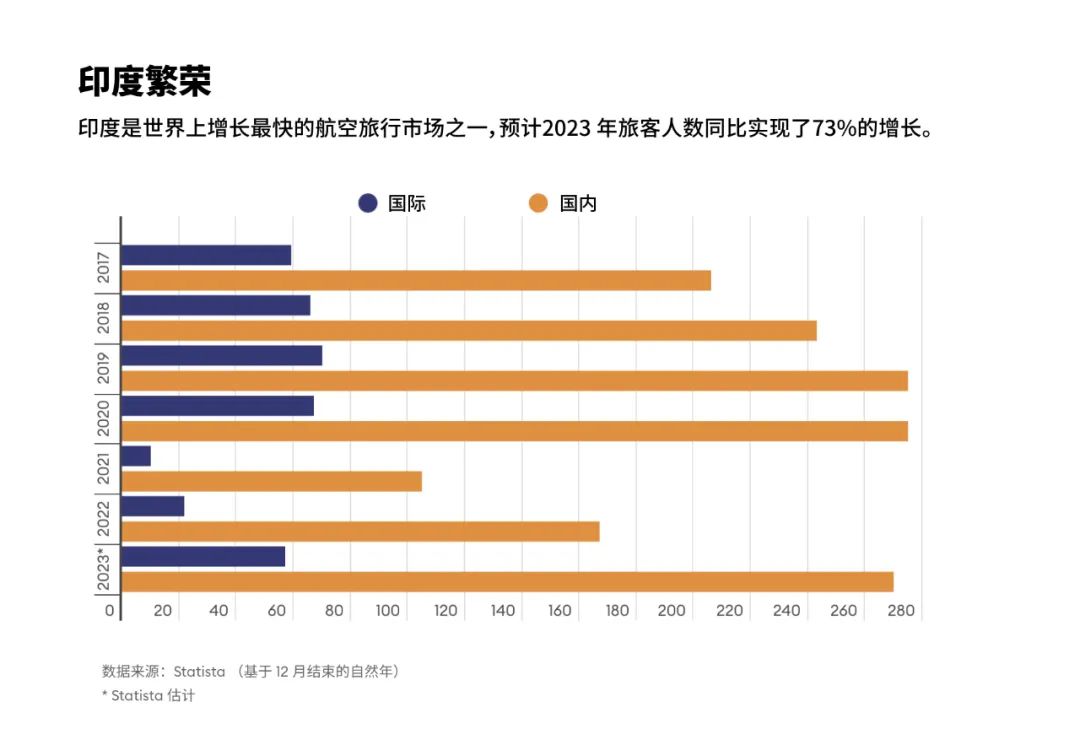 吴俊鹏说:“印度的航空市场正在增长,但服务明显不足。“而这正是印度的优势所在。以任何标准衡量,这里都不是一个成熟的航空市场。”据Statista的数据显示,去年预计有超过3.27亿印度乘客乘坐国内和国际航班,比前一年增长73%。随着印度经济的持续增长,航空旅行也将随之攀升,而新航现在正准备在这一市场中分得一杯羹,因为新加坡已经是印度游客前往许多国际目的地的传统枢纽。