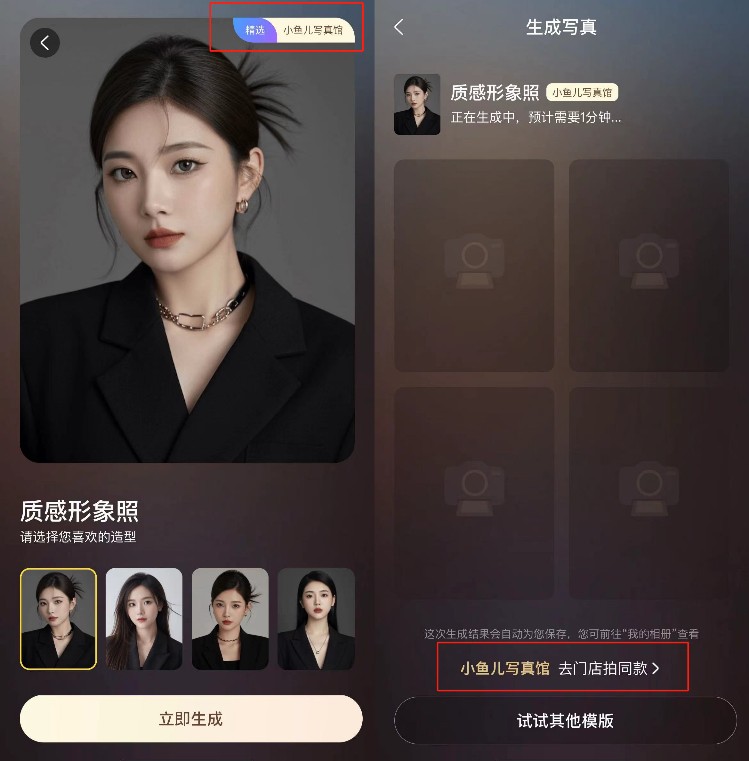 也就是说,“AI写真馆”的产品本身,并不会作为对应用户消费的终点,而是会成为相关实体店铺消费的起点——用户通过对应模板生成“预览照”,如果满意,再去线下实体店铺拍摄“精修照”,如果不满意,再换不同的造型“调试”一个满意的结果。