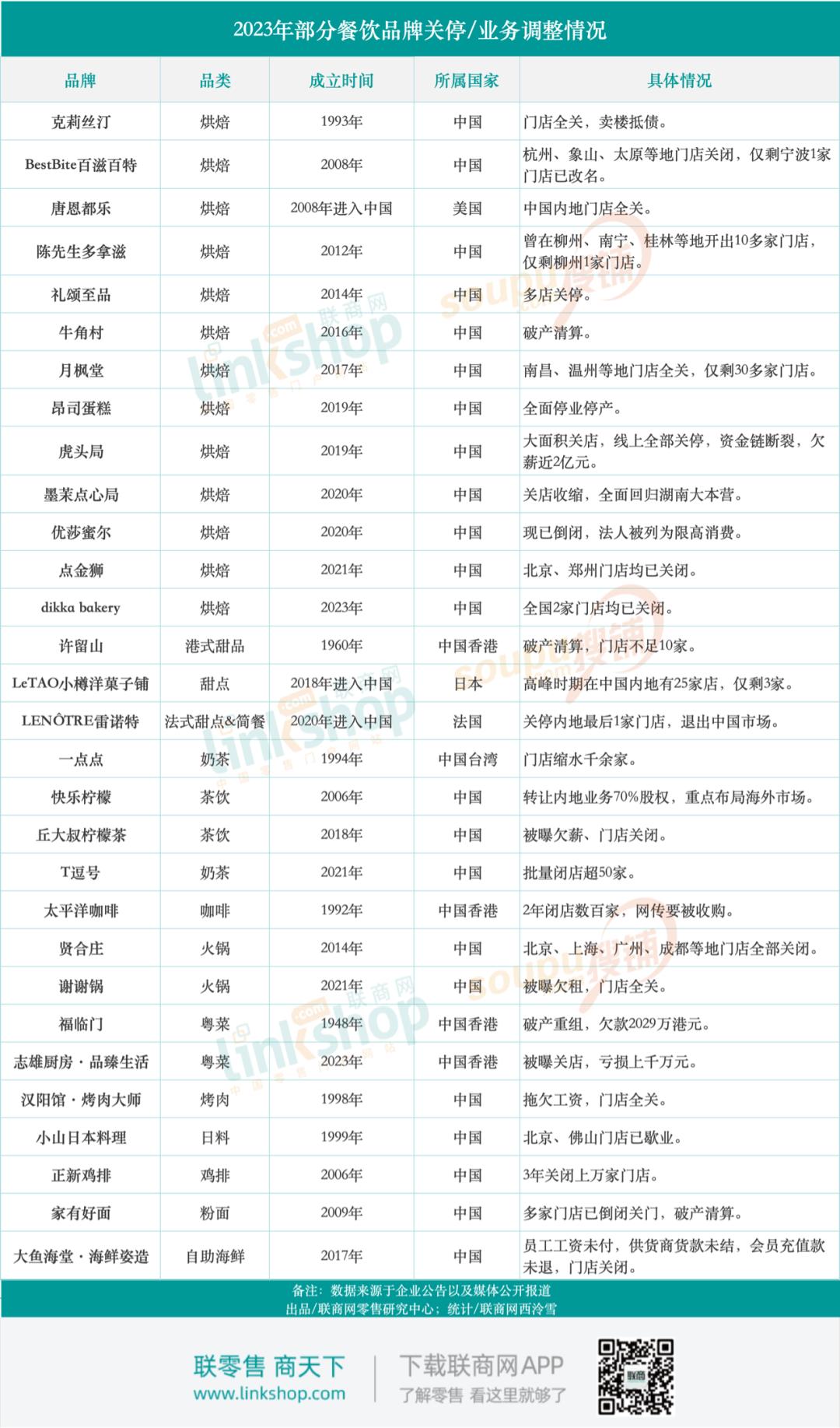 据联商网零售研究中心不完全统计,2023年,至少有30个餐饮品牌宣布倒闭或调整,其中既有昂司蛋糕、牛角村、丘大叔柠檬茶、谢谢锅等网红餐饮品牌,也 有克莉丝汀、 快乐柠檬、福临门、汉阳馆·烤肉大师等老牌餐饮品牌,以及LENÔTRE雷诺特、LeTAO小樽洋菓子铺等国际餐饮品牌。